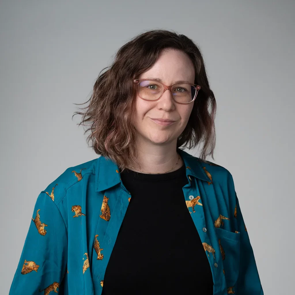 A woman wearing glasses and a camouflage shirt smiles in front of a table.