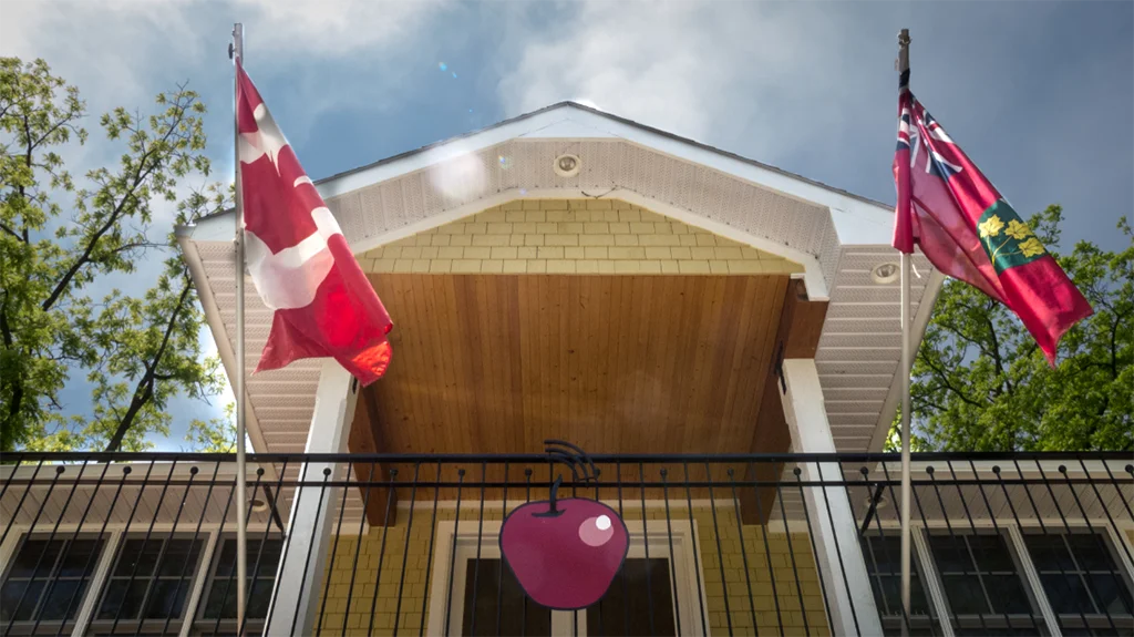 The virtual high school apple logo, and Canadian and Ontario flags flying from the balcony of the administrative office.